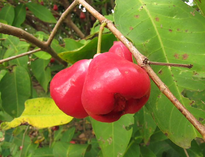 Он похож отдаленно на зеленый мангостин, которому не дали созреть. Я ела такой в Камбодже, но там он хотя бы стал фиолетовым. И крепление к ветке у них, кажется, разное. Если кто знает фрукт по имени, просветите.