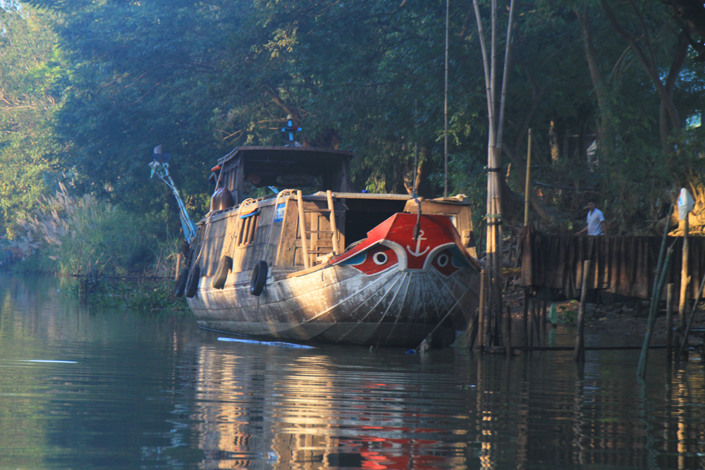 Из Камбоджи во Вьетнам мы добирались на туристическом кораблике по Меконгу. Он ходит из Пномпеня в этот самый Chau Doc (который непонятно как звучит — Тяу Док или Джо Док). Кораблик отплывает в 8:30 и идет около шести часов, стоимость 29$ с человека. Возле границы транспорт меняют на подобный, пересаживая туристов с обеих сторон. Два раза мы причаливали к погранзаставам, все было организовано по-вьетнамски четко и без очередей. Виды по дороге не очень интересные; красиво становится лишь под конец, когда кораблик уходит с Меконга в один из рукавов дельты, и тут уже начинается жизнь на воде.