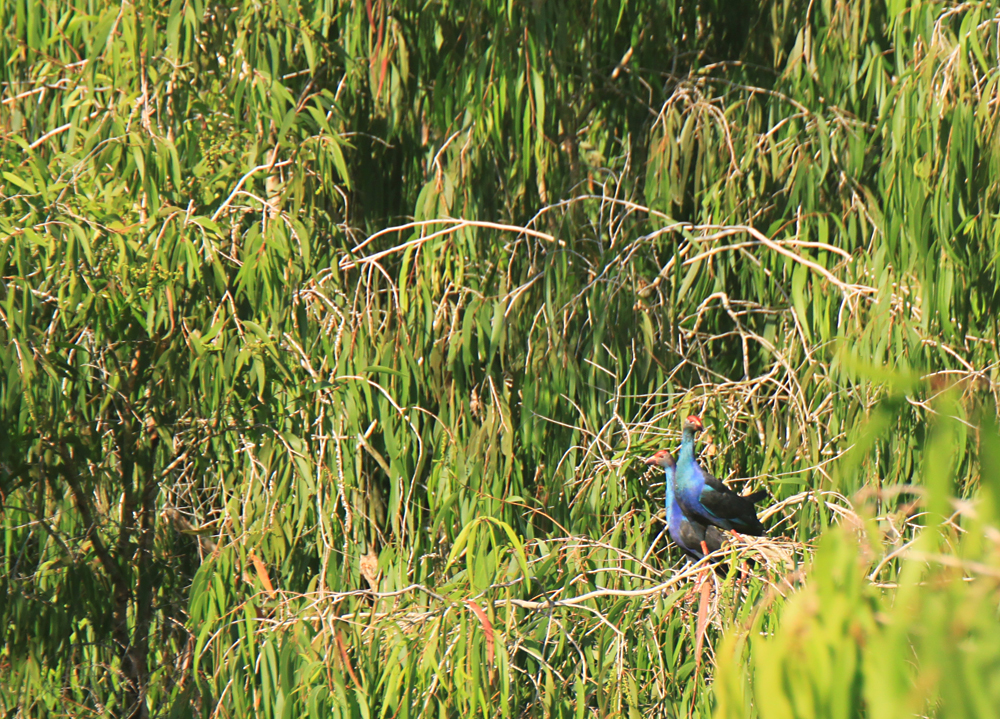 И вообще: для птиц нужен специальный огромный объектив, которого у нас нет и вряд ли когда-то будет. Ну и ладно. Вот эти синие птицы мне особенно понравились. Они похожи на новозеландских пукеко, но более яркие.