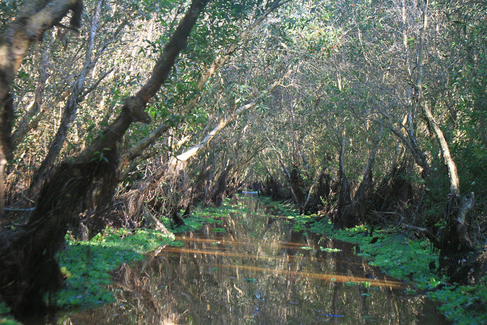 Этот чудесный лес, залитый водой, находится в дельте Меконга, во Вьетнаме. Ближайший город — Chau Doc. В этот лес не ступала нога лонлиплэнета. А если бы ступила, то утонула: тут можно передвигаться лишь на лодке. Лес даже не является нацпарком, хотя живность в нем охраняют и не обижают. В лесу сделали лодочные маршруты для местных туристов; они приезжают полюбоваться очень своеобразным пейзажем и посмотреть на множество ярких и красивых птиц. Райцентр Chau Doc находится близко от камбоджийской границы и далеко от Сайгона, поэтому редкий турист доплывет до Tra Su. Мы вот попали туда случайно.