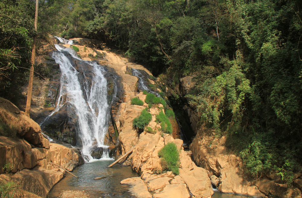 На следующий день мы ездили к Тигровому водопаду. Пять лет назад мы его просто не нашли, кружили возле деревни Trai Mat по полям и дорожкам. Сейчас мы вооружились собственноручно нарисованными треками. Последняя часть пути сложная, узкий горный серпаниин, местами без покрытия, с камнями и ухабами. Но вокруг красивый сосновый лес.